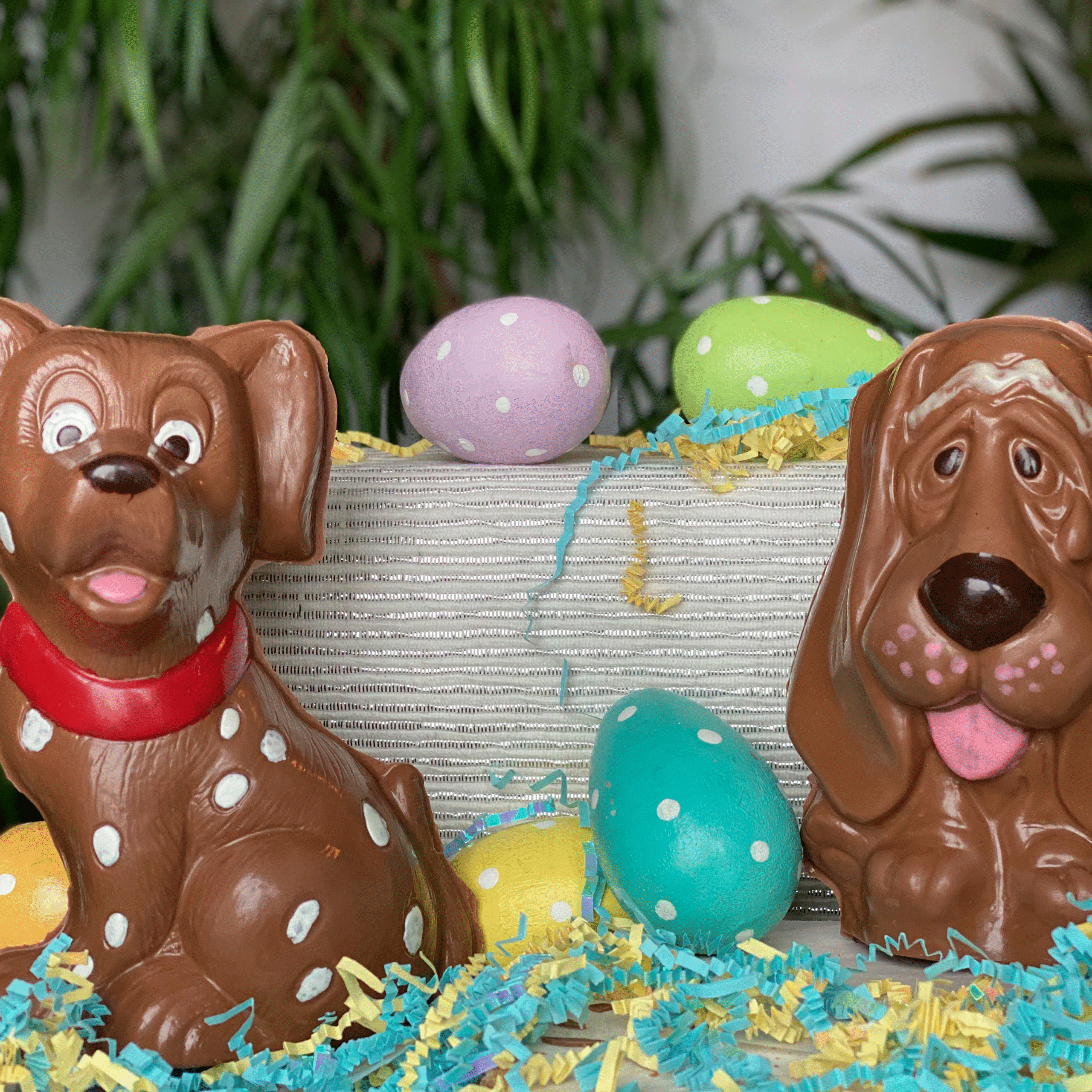 Figurine de chocolat en forme de chien offerte en noir, lait ou blanc.